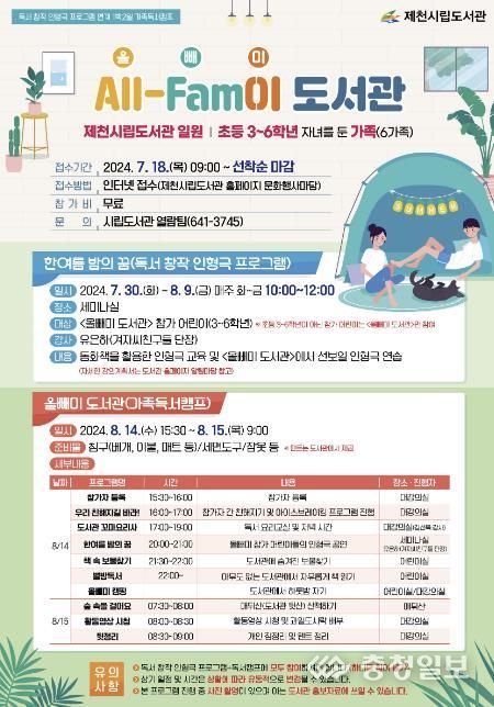 한편, All-Fam이(올빼미) 도서관 프로그램은 7월 18일부터 제천시립도서관 홈페이지(문화행사마당-도서관프로그램 수강신청)에서 신청 가능하며, 자세한 사항은 포스터 및 제천시립도서관 홈페이지에서 확인할 수 있다.