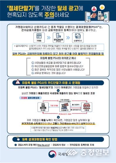 국세청은 공정세정과 건전한 시장질서를 확립하기 위해 미등록 결제대행업체 모니터링 및 적발, 가맹점 대상으로 미등록PG 단말기 사용주의 안내 등 전방위적으로 미등록 결제대행업체의 불법행위에 엄정 대응하고 있다.
