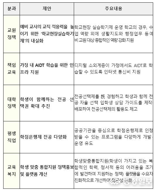 2030 자문단은 이번 간담회에서 ▲예비 교사의 교직 적응력을 높이기 위한 ‘학교 현장 실습학기제’의 내실화(교원정책분과), ▲가정 내 인공지능 디지털 교과서 학습을 위한 시설 지원(책임교육분과), ▲학생이 함께하는 전공선택권 확대 추진(대학정책분과), ▲학점은행제 전공 다양화(평생직업분과), ▲학생 맞춤 통합지원 홍보 및 플랫폼 개선(교육복지분과) 등 주요 정책 제안 과제로 정책 담당자들과 토의한다.