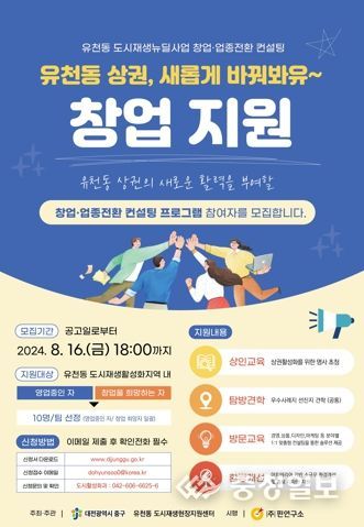 충청일보 곽채영 기자 | 대전 중구는 유천동 도시재생 뉴딜사업의 일환으로 ‘창업·업종 전환 컨설팅(2차)’ 참여자(10명)를 오는 8월 16일까지 모집한다고 밝혔다.