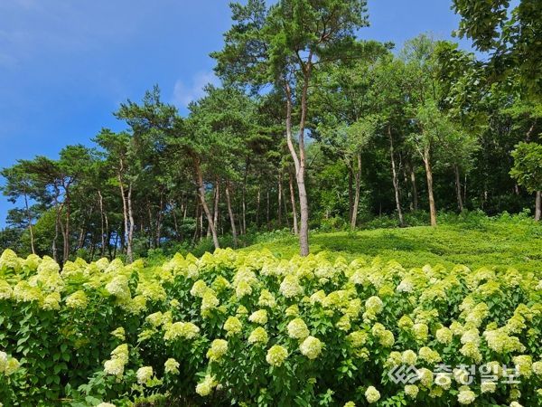 청양군에 따르면 맑은물사업소에서 공설운동장 방향 도로변 가로화단과 우산 산림조경숲에서 만개한 목수국을 만날 수 있다.