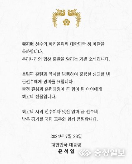 충청일보 김은경 기자 | 윤석열 대통령은 2024 파리 하계올림픽에서 지난 3일 동안 메달을 획득한 대한민국 선수 14명 각자에게 국민 모두의 마음을 담아 축전을 보냈다.
