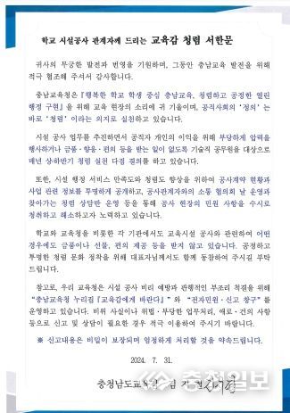 청렴 서한문에는『행복한 학교 학생 중심 충남교육, 청렴하고 공정한 열린 행정』을 구현하기 위한 충남교육청의 의지 표명과 어떠한 경우라도 금품이나 선물, 편의 제공 등을 받지 않는다는 점을 강조하면서, 부조리 척결을 위해 비위 사실, 위법․부당한 업무처리에 대해 신고 체계를 운영하고 있음을 안내했다.