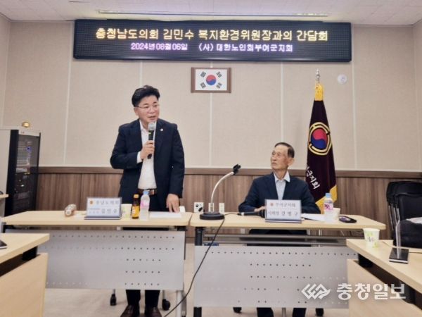 충청일보 박사현 기자 | 충남도의회 복지환경위원회 김민수 위원장(비례·더불어민주당)은 6일 대한노인회 부여군지회와의 간담회를 개최하고, 노인복지 관련 지역 현안에 대한 의견을 나눴다.