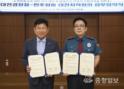 충청일보 곽채영 기자 | 대전경찰청은 6일 민주평화통일자문회의 대전지역회의와 업무협약을 체결하고 평화통일에 대한 시민들의 인식 개선과 북한이탈주민들의 안정적인 사회 정착을 위한 상호 교류 협력에 나선다.