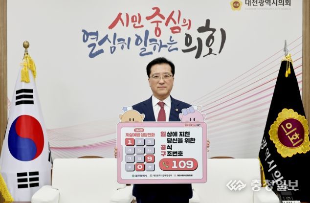 충청일보 곽채영 기자 | 대전시의회 조원휘 의장은 8일, 일류 생명 존중 도시 대전 구현을 위한‘내 마음을 살리는 번호 109’자살예방 릴레이 캠페인에 동참했다.