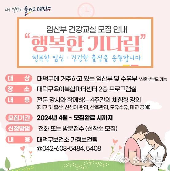 충청일보 곽채영 기자 | 대전 대덕구는 지역 내 임산부·수유부·신혼부부 등을 대상으로 임산부 건강교실 프로그램 ‘행복한 기다림’ 3기 대상자를 모집한다고 밝혔다.