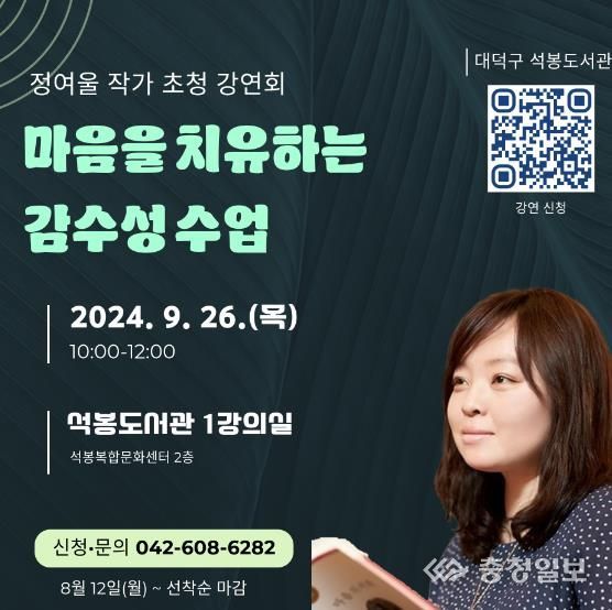 충청일보 곽채영 기자 | 대전 대덕구는 9월 독서의 달을 기념해 오는 9월 26일 석봉도서관에서 정여울 작가를 초청해 강좌를 개최한다고 밝혔다.