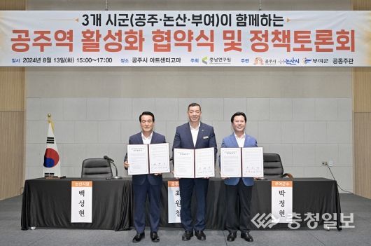충청일보 박사현 기자 | 공주시는 13일 아트센터 고마에서 KTX공주역 활성화를 위해 논산시, 부여군과 업무협약을 체결했다.