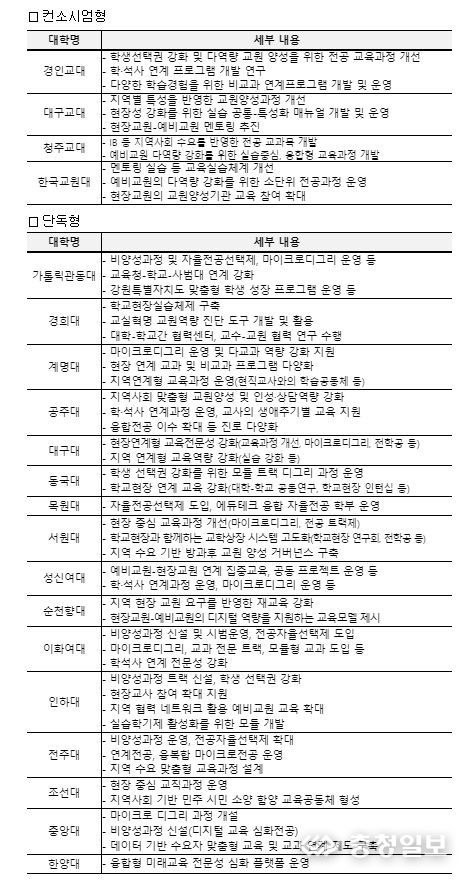이번 사업 공모에 총 38개 사업단(1개 대학 단독형 또는 2개 이상 대학으로 구성된 연합체)이 교원양성과정 개선 사업 계획서를 제출(7.18., 신청마감)했으며, 서면평가와 온라인 대면평가를 거쳐 20개 사업단이 지원 대상으로 선정됐다. 평가 결과에 이의가 있는 대학은 8월 23일까지 평가 결과에 대해 이의신청할 수 있으며 그 결과는 8월 말에 최종 확정된다.
