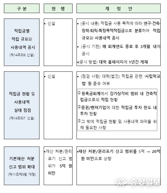 이번 시행령 개정은 사립대학과 학교법인의 적립금 공시와 실태 점검을 의무화하는 「사립학교법」이 개정(2024.8.28. 시행)됨에 따라 관련 세부사항을 규정하기 위해 이루어졌다.
