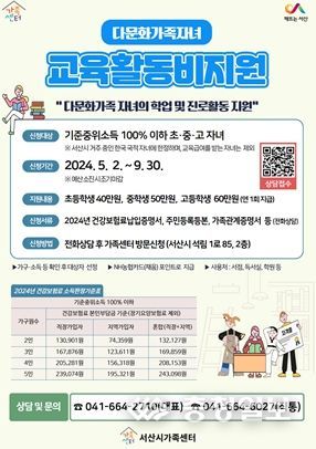 충청일보 박사현 기자 | 서산시가족센터는 다문화가족 자녀의 학습격차 해소와 미래인재 육성을 위한 ’다문화가족 자녀 교육활동비지원사업‘ 대상자 추가 접수를 실시한다.