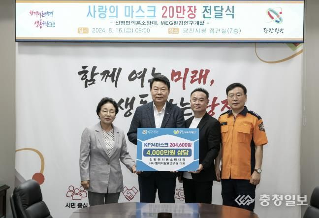 충청일보 박사현 기자 | 신평면의용소방대·MEG환경연구개발의 안성순 대표가 16일 당진시를 방문해 사랑의마스크 201,600장(4,000만 원 상당)을 기부했다.