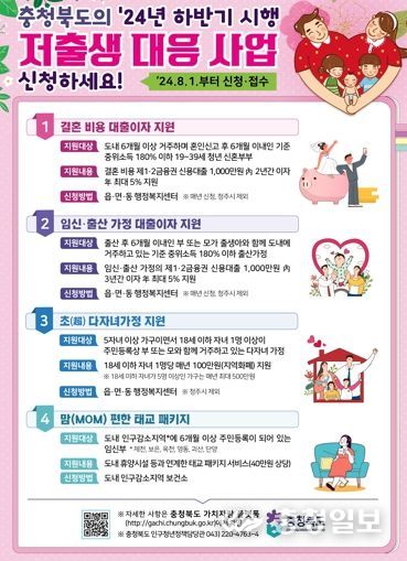 충청일보 김문호 기자 | 충주시는 16일, 안전하고 행복한 임신·출산 환경을 조성하고 저출생 위기 극복을 위해 저출생 대응 신규사업 3가지를 시행한다고 밝혔다.