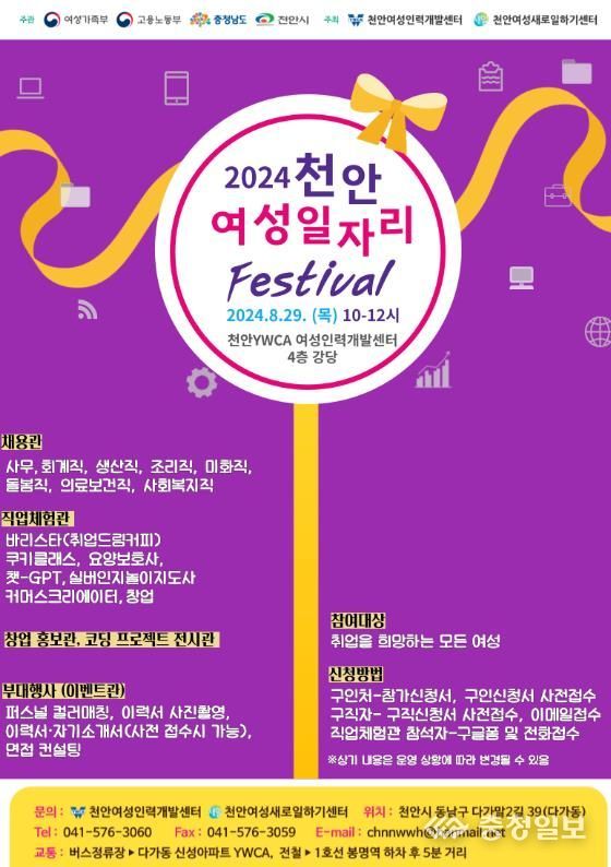 충청일보 박사현 기자 | 여성가족부, 고용노동부, 충청남도, 천안시가 주관하고 천안여성인력개발센터·천안여성새로일하기센터가 주최하는 ‘천안여성일자리 Festival’이 8월29일 오전10시부터 12시까지 천안YWCA여성인력개발센터 4층 강당에서 개최된다.