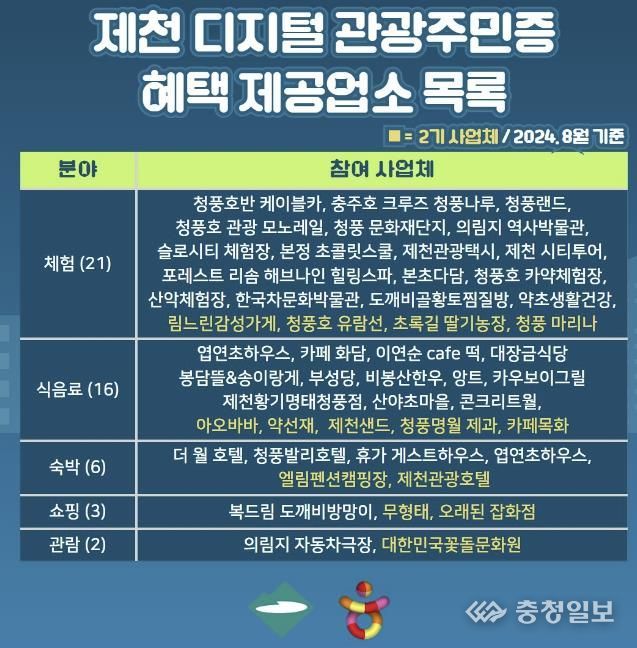 이번 2기 혜택업체에는 △ 제천 관광호텔(구 서울 관광호텔, 숙박비 10% 할인), △ 청풍 마리나(체험비 30% 할인), △ 청풍호 유람선(탑승료 3,000원 할인) 등 14곳의 주요 관광 관련 업소들이 참여했다.