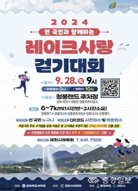 충청일보 김문호 기자 | 제천시체육회는 오는 9월 28일 오전 9시 걷기 좋은 계절 가을, 아름다운 풍경에 취하는 청풍호반에서‘2024 레이크사랑 걷기대회’를 개최한다.