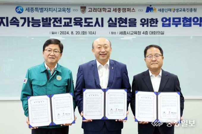 충청일보 김정운 기자 | 세종특별자치시교육청, 고려대학교 세종캠퍼스, 세종인재평생교육진흥원 등 총 3개 기관이 8월 20일에 청사 4층 대회의실에서 지속가능발전교육도시 실현을 위한 업무협약을 체결했다.