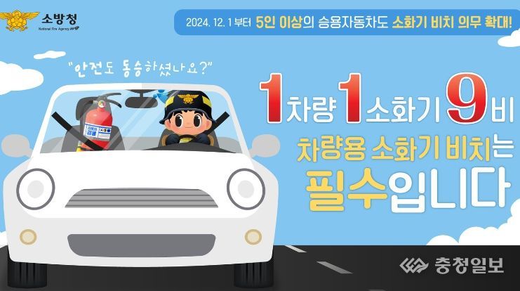 ‘소방시설 설치 및 관리에 관한 법률’ 제11조에 의하면 올해 12월 1일부터 제작·수입·판매하는 자동차와 수유권이 변동되어 자동차관리법 6조에 따라 등록된 5인 이상의 모든 차량에 소화기를 의무적으로 비치하도록 법이 개정됐다.