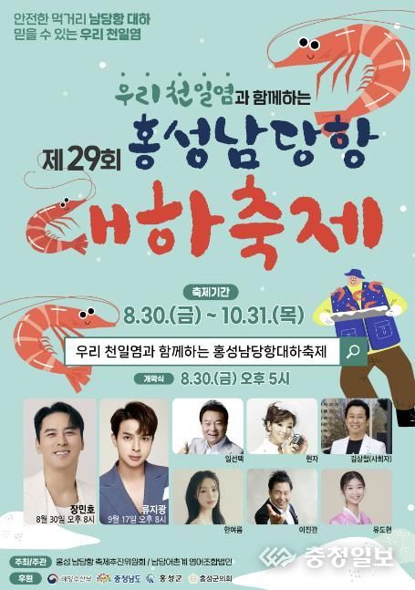 천수만 맛포구 남당항 최고의 수산물이자 대표 먹거리인 ‘대하’를 맛볼 수 있는 제29회 홍성남당항 대하축제가 오는 8월 30일부터 10월 31일까지 홍성군 서부면 남당항 일원에서 화려하게 펼쳐진다.