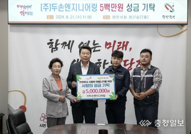 충청일보 박사현 기자 | 당진시는 ㈜두손엔지니어링 최현우 대표가 21일 당진시청을 방문해 노인들의 여름나기를 돕기 위해 성금 500만 원을 전달했다고 밝혔다.