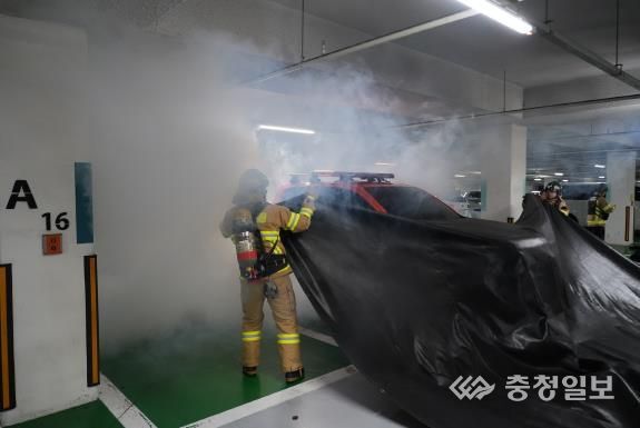충청일보 김정운 기자 | 조치원소방서가 지난 21일 조치원읍 자이아파트 지하주차장에서 전기 자동차 화재진압 훈련을 했다.