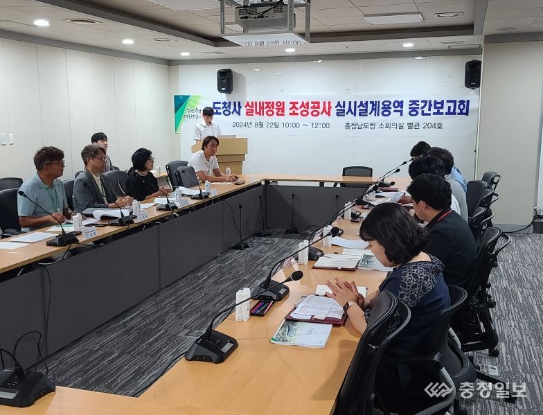 충청일보 박사현 기자 | 충남도는 22일 도청 소회의실에서 ‘도청사 실내 정원 조성 설계용역’ 중간보고회를 열고, 용역 진행 상황을 점검했다.