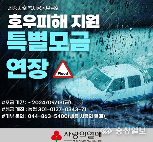 충청일보 김정운 기자 | 세종사회복지공동모금회는 집중호우 피해지원 특별모금을 9월 13일까지 기간을 연장하여 진행하기로 했다.