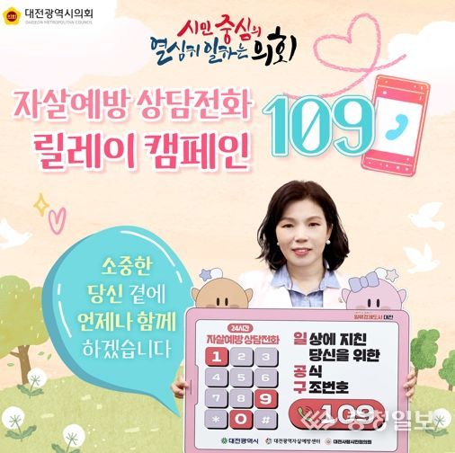 충청일보 곽채영 기자 | 대전시의회 이금선 교육위원장이 일류 생명 존중 대전시 구현을 위한 ‘내 마음을 살리는 번호 109’자살예방 릴레이 캠페인에 동참했다.