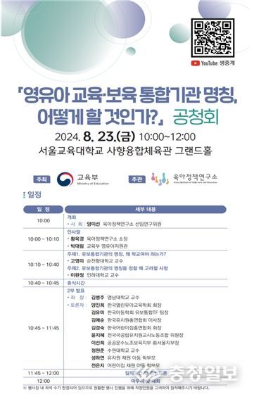 충청일보 김은경 기자 | 교육부와 육아정책연구소는 8월 23일, 서울교육대학교에서 영유아 교육·보육 통합기관 명칭에 대한 의견을 수렴하기 위해 대국민 공청회를 개최한다.