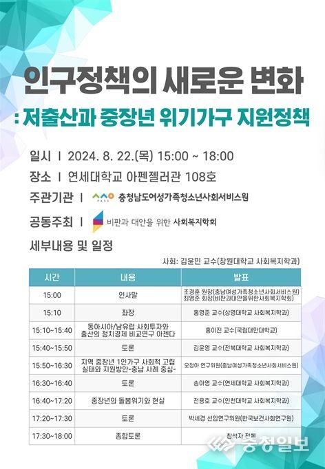 충청일보 박사현 기자 | 충남여성가족청소년사회서비스원은 2024년 8월 22일 비판과대안을 위한 사회복지학회와 ‘인구정책의 새로운 변화’를 주제로 공동세미나를 진행했다.