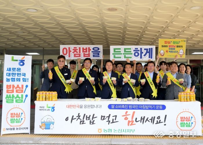 충청일보 박사현 기자 | NH농협은행 충남본부와 논산시지부가 23일 우리 쌀 소비 촉진을 위한 ‘아침밥 먹기’캠페인을 실시했다.