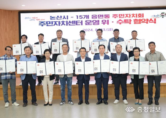 충청일보 박사현 기자 | 논산시가 23일 시청 회의실에서 관내 15개 읍면동 주민자치회와 ‘주민자치센터 운영 민간위탁 협약’을 체결했다.