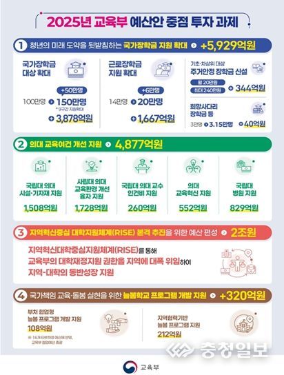 충청일보 김은경 기자 | 교육부는 2025년 예산안에 104조 8,767억원을 편성했다고 밝혔다.