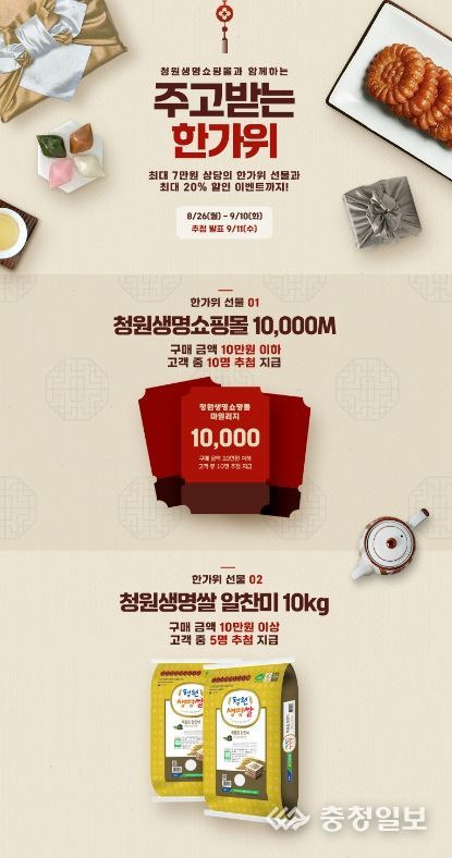 또 10만원 이하 구매고객 중 10명을 추첨해 마일리지 1만점을 증정할 예정이며, 10만원 이상 구매고객 대상 중에서는 5명을 추첨해 청원생명쌀(알찬미) 10kg을 증정한다. 추첨 발표는 9월 11일에 진행된다.