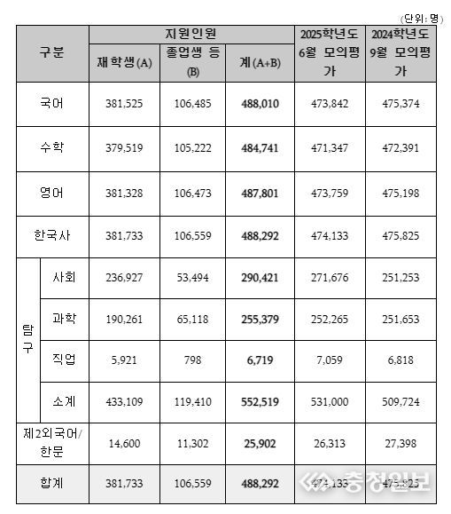 이번 9월 모의평가에 지원한 수험생은 488,292명으로, 재학생은 381,733명이고 졸업생 등 수험생은 106,559명이다.