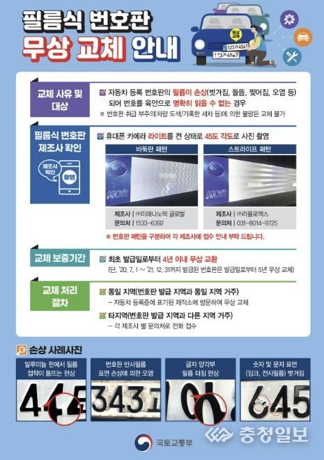 충청일보 박사현 기자 | 청양군은 2020년 7월부터 발급된 자동차 필름식 등록번호판의 들뜸 벗겨짐 등의 불량 현상으로 인해 훼손된 경우 새로운 번호판으로 무료 교체가 가능하다고 밝혔다.