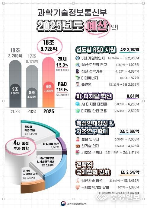 충청일보 김은경 기자 | 과학기술정보통신부는 2025년도 정부 예산안 및 기금운영계획안에 편성된 과기정통부 예산(안)은 총 19조원으로, 2024년 17.9조원 대비 5.9% 증가한 규모로 편성했다고 밝혔다.