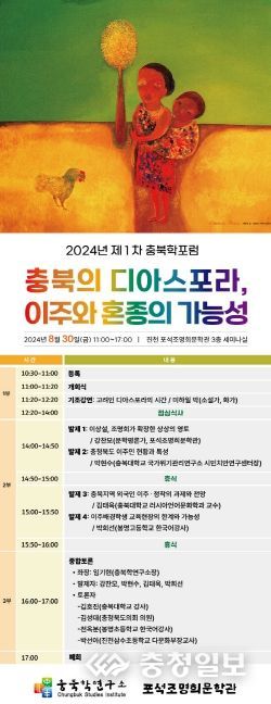 충청일보 김문호 기자 | 진천군은 오는 30일 오전 11시 진천 포석조명희문학관에서 2024년 제1차 충북학포럼 ‘충북의 디아스포라, 이주와 혼종의 가능성’ 포럼을 충북학연구소와 포석조명희문학관이 공동 개최한다고 28일 밝혔다.