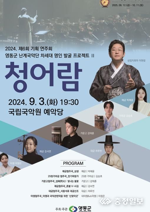 충청일보 김문호 기자 | 충북 영동군이 제6회 영동군 난계국악단 차세대 명인 발굴 프로젝트‘청어람’ 2차 공연을 개최한다.