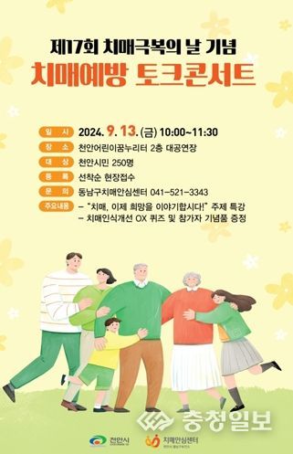 충청일보 박사현 기자 | 천안시 동남구 치매안심센터는 9월 13일 천안어린이꿈누리터 대공연장에서 치매 인식 개선과 치매 극복을 위한 ‘제17회 치매극복의 날 기념 치매예방 토크 콘서트’를 개최한다고 29일 밝혔다.