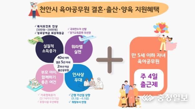 충청일보 박사현 기자 | 천안시가 육아기 자녀를 둔 공무원을 대상으로 주 4일 출근제를 시행하는 등 다양한 출산·육아 관련 인센티브를 제공한다고 29일 밝혔다.