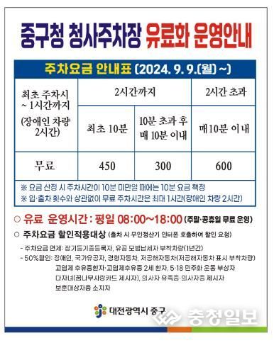 충청일보 곽채영 기자 | 대전 중구는 청사 방문 목적 이외의 장기 주차 등으로 주차 공간이 부족하여 발생하는 민원을 해소하고 민원인들의 주차 편의를 제공하고자 구청사 부설주차장 요금을 인상한다고 밝혔다.