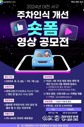 충청일보 곽채영 기자 | 대전 서구는 이달 2일부터 다음 달 18일까지 주차인식 개선 숏폼영상 공모전 출품작을 접수한다.