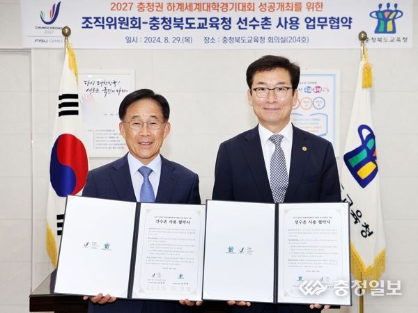 충청일보 김문호 기자 | 충청북도교육청은 29일, 2027 충청권 세계대학경기대회 조직위원회와 도교육청 본관 204호 회의실에서 충남 보령에 위치한 해양교육원을 비치발리볼 경기의 선수촌으로 활용하는 협약을 체결했다.