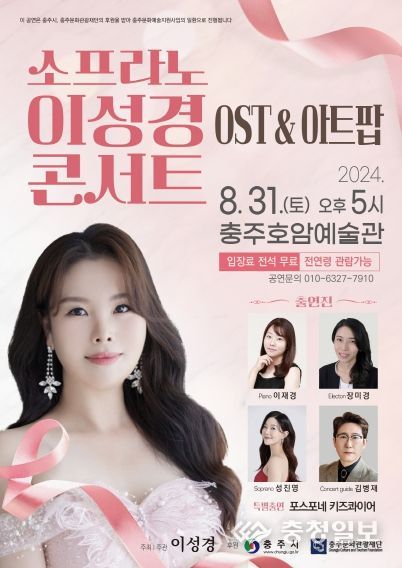 충청일보 김문호 기자 | 오는 8월 31일, 소프라노 이성경의 아트팝 & OST 콘서트가 충주호암예술관에서 진행된다. 이번 콘서트는 충주시와 충주문화관광재단의 후원으로 마련됐으며, 소프라노 이성경만의 감성과 색깔을 담은 다양한 아트팝 가곡과 영화, 드라마 OST를 통해 관객들에게 감동적인 음악을 선사할 예정이다.