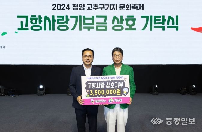 충청일보 박사현 기자 | 청양군은 지난 8월 30일 고추․구기자문화축제 개막식에서 김돈곤 청양군수와 박희조 대전 동구청장이 고향사랑 상호기부(3백5십만원) 기탁식 및 응원메시지를 전달하는 행사를 가졌다고 밝혔다.