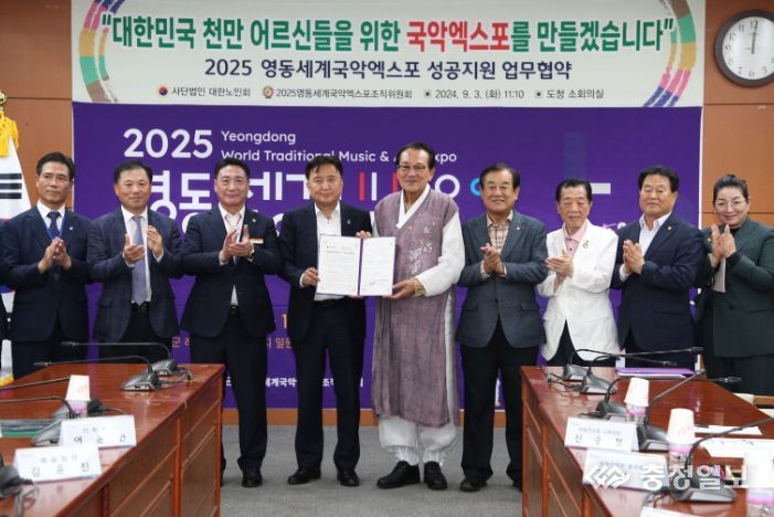 충청일보 김문호 기자 | 영동세계국악엑스포조직위원회(조직위원장 김영환)는 9월 3일 충북도청 소회의실에서 대한노인회(회장 김호일)와 영동국악엑스포 성공개최를 위한 업무협약을 체결했다고 밝혔다.