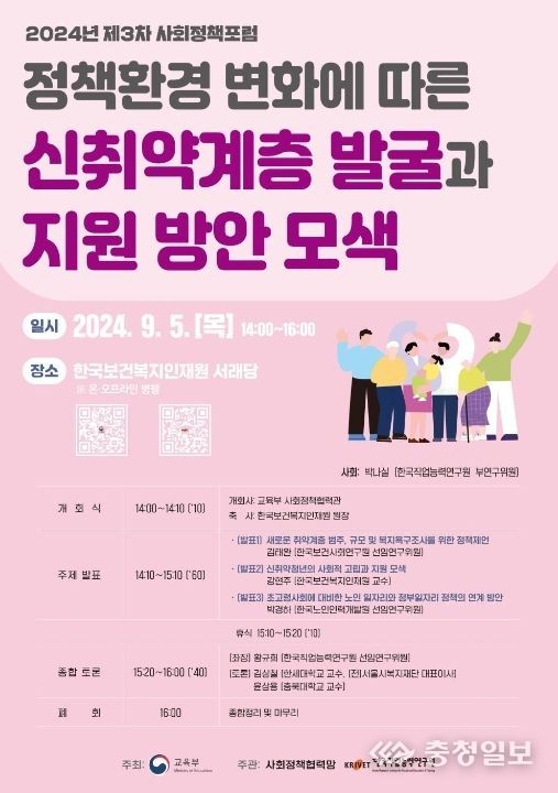 충청일보 김은경 기자 | 교육부는 9월 5일, 한국보건복지인재원(충북 청주)에서 ‘정책환경 변화에 따른 신(新) 취약계층 발굴과 지원’을 주제로 2024년 제3차 사회정책 공개 토론회(포럼)를 개최한다.