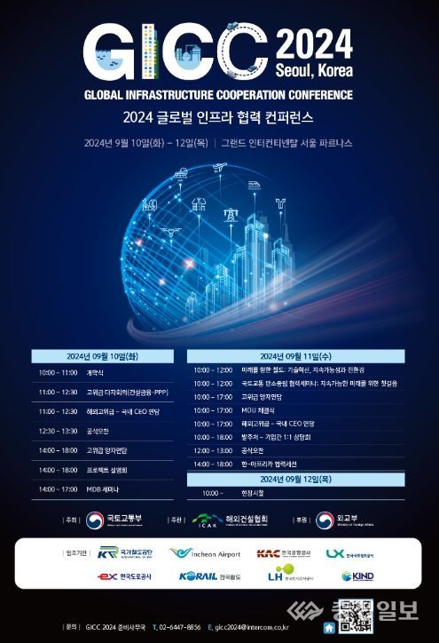 충청일보 김은경 기자 | 국토교통부가 주최하고 해외건설협회(회장 한만희)가 주관하는 ‘2024 글로벌 인프라 협력 콘퍼런스’(Global Infrastructure Cooperation Conference, GICC)가 9월 10일부터 3일간 서울에서 개최된다.